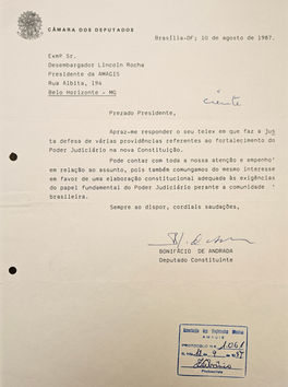 Correspondência do deputado constituinte Bonifácio de Andrada, agradecendo as sugestões da Amagis para o fortalecimento do Judiciário na nova Constituição, em 1987.